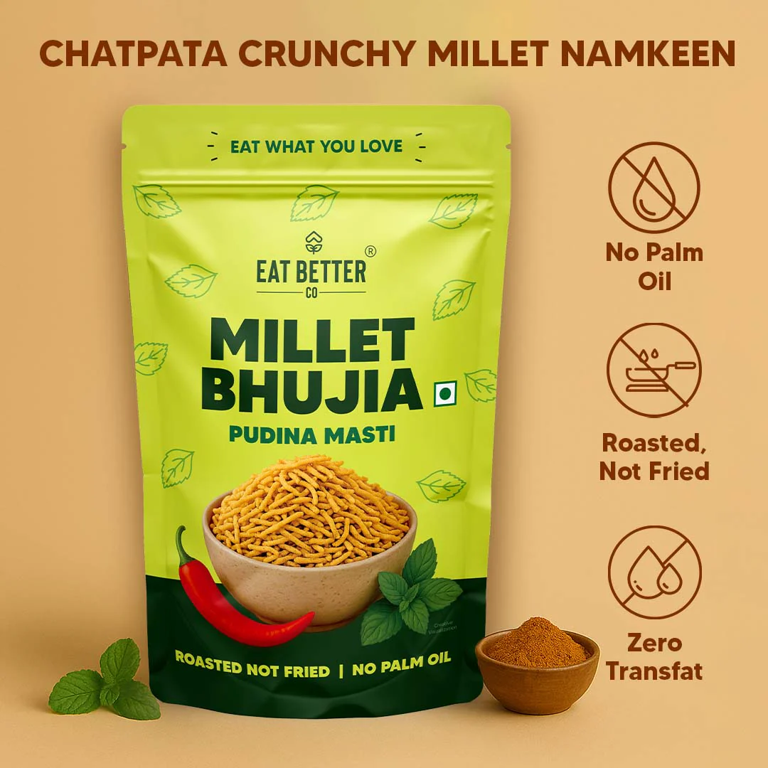 A crunchy, joyful twist on the classic Bhujia – made with wholesome ingredients & roasted to perfection. Crispy, favoured with refreshing mint & aromatic spices. A snack that makes every bite a delight.