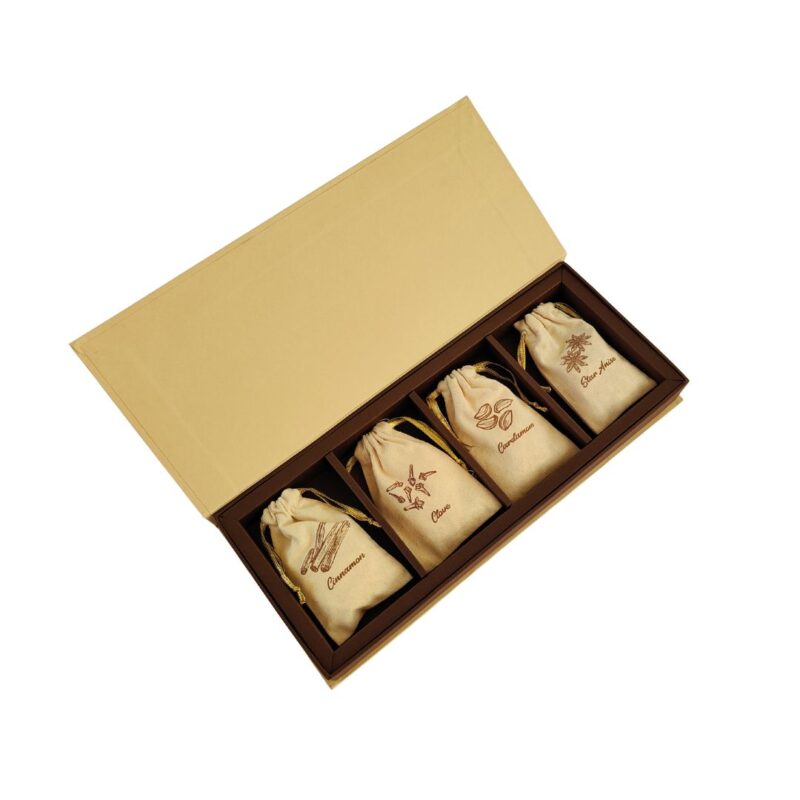 Contents: Outer Box, 4 spice pouches with Cinnamon, Star Anise, Pepper, Clove – 80 gms